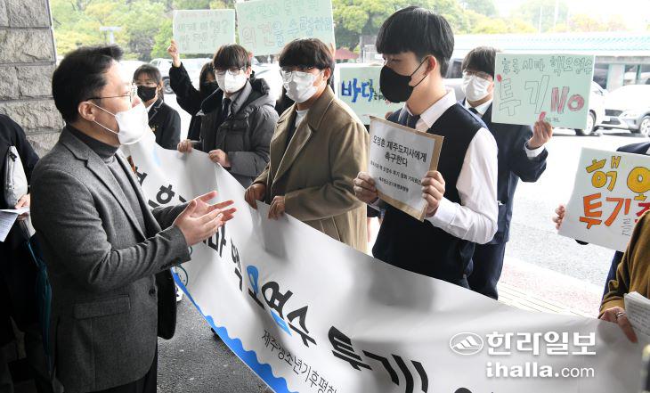 제주청소년기후평화행동 단원들이 지난 13일 제주도정의 후쿠시마 핵오염수 해양투기 대응을 촉구하는 기자회견 이후 제주도지사 면담을 요청 서한을 전달하기 위해 제주도청을 항의 방문하고 있다. 한라일보DB