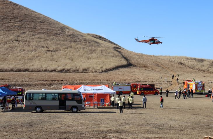 훈련은 새별오름 들불축제장에 불 놓기 행사 중 강한 돌풍으로 오름 동측 안전요원 및 운영부스 체험객이 화염 및 연기에 갇혀 다수사상자 발생한 상황을 가정해 진행됐다.