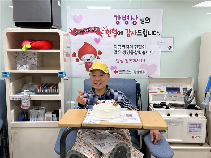 강씨는 "남들보다 조금 늦었지만 그동안 꾸준히 헌혈을 했다"며 "생애 마지막 헌혈에 참여하고 나니 뿌듯하지만 한편으로는 더 이상 참여할 수 없다는 생각에 아쉬움도 크다"고 말했다. 대한적십자사 제주특별자치도혈액원은 이날 강씨에게 감사의 마음을 전하기 위해 케익을 전달하는 등 헌혈 정년식을 열었다.