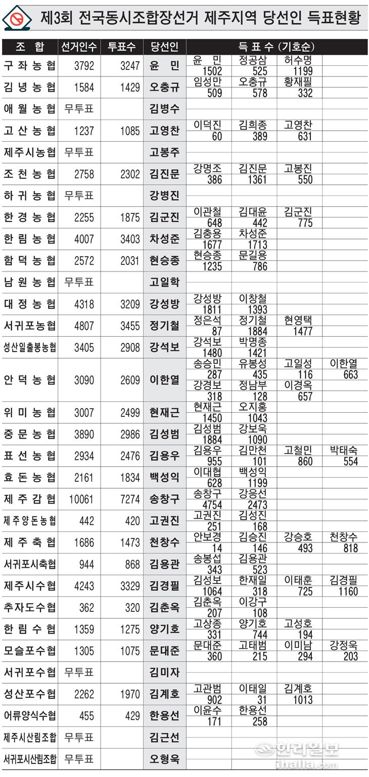 [조합장선거] 제3회 전국동시조합장선거 제주지역 득표현황