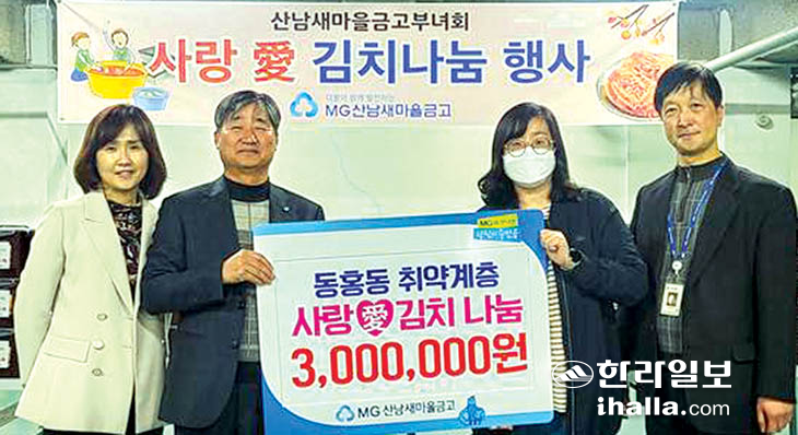 산남새마을금고(이사장 박성길)와 MG산남 부녀회(회장 원희순)는 지난 10일 김치(300만원 상당) 담그기 봉사활동을 전개했다.