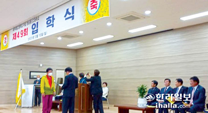 법무부 청소년범죄예방위원 제주지역협의회 김봉옥 감사는 지난 12일 제주방송통신고등학교 입학식에서 만학으로 입학하는 학생 2명에게 청암 장학금을 전달했다.