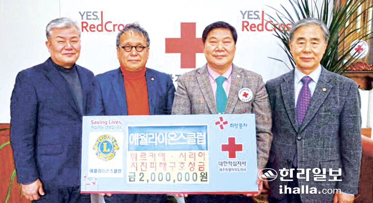 애월라이온스클럽(회장 양홍전)은 지난 13일 대한적십자사제주특별자치도지사(회장 정태근)를 방문해 튀르키예·시리아 지진 이재민 지원을 위해 써달라며 성금 200만원을 전달했다.