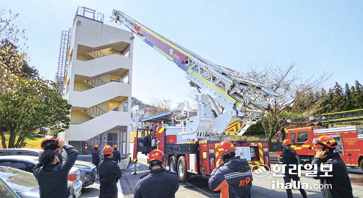 제주소방서 이도119센터(센터장 전홍균)는 16일 소방교육대에서 고층건축물 화재 등 재난 대응을 위한 고가사다리차 조작 훈련을 실시했다.