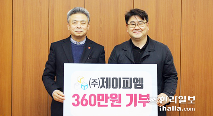 주식회사 제이피엠(대표이사 강미란)은 지난 15일 제주특별자치도자원봉사센터(센터장 고태언)를 통해 '찾아가는 맞춤형 자원봉사 추진 사업' 지원을 위해 360만원을 전달했다. 이 기부금은 제주지역의 취약계층을 위한 집수리 등에 쓰여질 예정이다.