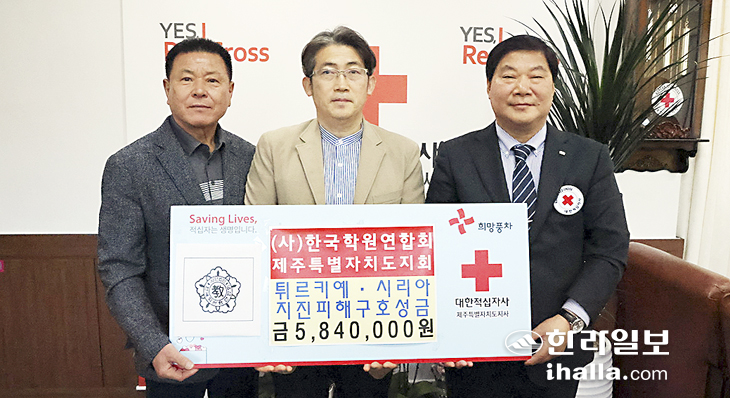 (사)한국학원연합회제주특별자치도회(회장 고성만)는 지난 15일 대한적십자사제주특별자치도지사(회장 정태근)를 방문해 튀르키예·시리아 지진 이재민 지원을 위해 써달라며 성금 584만원을 전달했다.