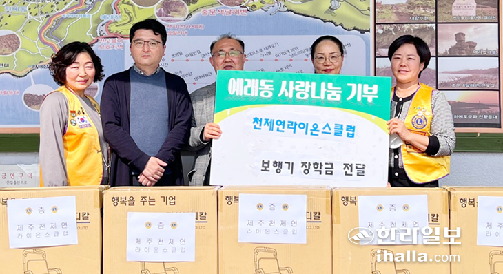 천제연 라이온스클럽(회장 오애숙)은 지난 15일 서귀포시 예래동(동장 나의웅)을 방문, 거동이 불편한 어르신과 경제적으로 어려운 대학생에게 전달해달라며 보행기 5대와 장학금을 전달했다.