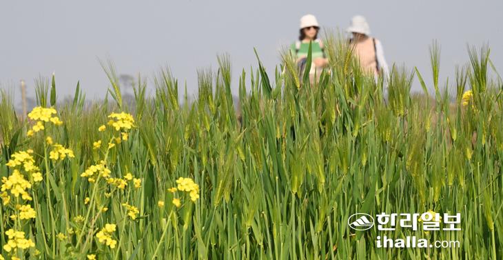 완연한 봄날씨를 보인 16일 서귀포시 대정읍 하모리 보리밭에 어느새 보리이삭이 패어 봄소식을 전해 주고 있다. 강희만기자