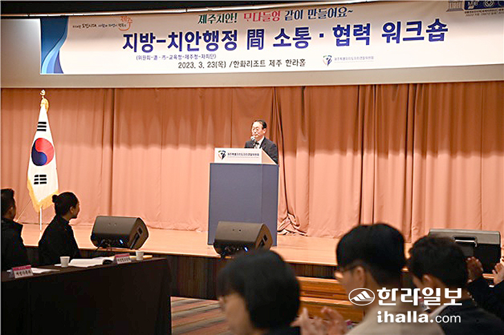 제주특별자치도 자치경찰위원회(위원장 김용구)는 23일 자치경찰제 시행 3년차를 맞아 지방행정과 치안행정 간 소통·협업을 통한 제주지역 치안역량 강화를 위해 한화리조트 세미나실에서 자치경찰 관련 사무를 담당하는 5개 기관 부서장 등 120여명이 참석하는 소통·협력 워크숍을 개최했다.