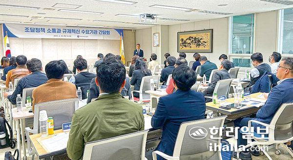제주지방조달청(청장 황광하)은 23일 제주자치도를 비롯한 도내 30여 수요기관과 지역 6개 우수기업을 초청해 '2023년 조달정책 소통과 규제혁신 수요기관 간담회'를 개최했다.