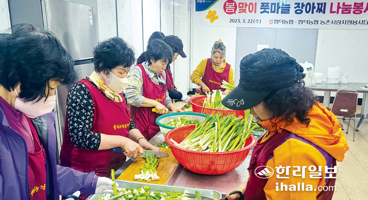 함덕농협(조합장 현승종)과 농촌사랑자원봉사단(단장 부연희)은 지난 22일 농협 여성복지센터에서 회원 30여명이 참여해 마늘장아찌를 만들어 지역내 홀로사는 어르신 등 취약계층 80여가구에 직접 전달하고 안부를 묻는 봉사활동을 벌였다.
