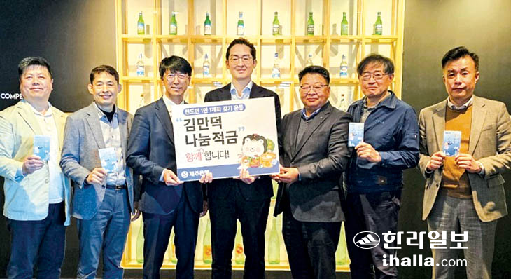 제주 향토기업 (주)한라산(대표 현재웅) 임직원들이 최근 제주은행(은행장 박우혁)과 김만덕재단(이사장 양원찬)이 함께 하는 全도민 '나눔실천 1계좌 갖기 운동'에 동참했다. 이에 따라 기부금 출연한 신청한 이들이 적금 만기 후 이자 일부를 기부하면 제주은행이 일대일 매칭 기부금을 추가 조성해 김만덕재단에 출연하게 된다.