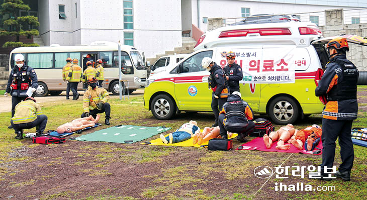 제주서부소방서(서장 김영호)는 지난 23일 교통사고를 가정해 다수사상자 발생 대비 선착구급대 임시의료소 설치 운영 훈련을 실시했다.
