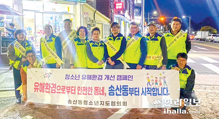 서귀포시 송산동청소년지도협의회(회장 현석민)는 지난 27일 청소년지도위원, 동 주민센터 직원 등 10여명이 참석한 가운데 지역 내 칠십리음식특화거리를 중심으로 청소년 유해환경 개선 캠페인을 실시했다.