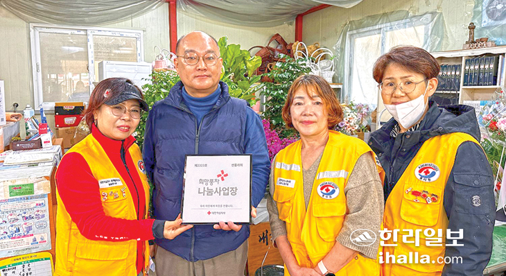 대한적십자사제주특별자치도지사(회장 정태근)는 지난 29일 서귀포시 성산읍 소재 썬플라워(대표 홍선영)에서 적십자 희망풍차 나눔사업장 명패 전달식을 실시했다. 썬플라워는 성산읍 관내 위기가정 긴급지원을 위해 매월 일정금액을 적십자사에 기부하고 있다.