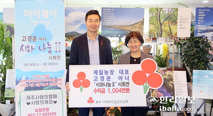고경준 아너 소사이어티 회원(제일농장 대표)이 지난 29일 제주시 연동 소재 카페 '모네의화원(대표 김성준)'에서 시화전 수익금 1004만원을 제주사회복지공동모금회(회장 강지언)에 기부했다. 이번 성금은 도내 푸드뱅크·푸드마켓 지원 사업에 사용될 예정이다.
