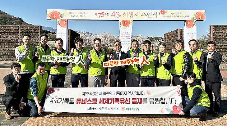 농협제주본부(본부장 윤재춘)는 지난달 31일 제주시 봉개동 소재 제주4·3평화공원에서 고희범 제주4·3평화재단 이사장과 농협 임직원 20여명이 참석해 NH 기억나눔 봉사단(단장 양주필 제주농협 경영부본부장) 발대식을 갖고, 4·3희생자 추념식을 앞두고 평화공원에 메리골드 등 계절화 500본을 심었다.
