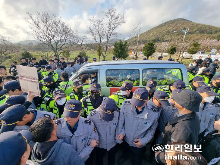 3일 제주4·3 평화공원에서 집회를 시도한 서북청년단의 차량을 시민단체 등이 막아서자 경찰이 격리조치하고 있다. 제주도사진기자회