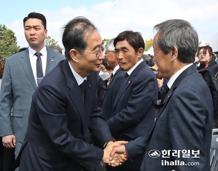 | 한덕수 국무총리가 3일 열린 제75주년 제주4·3희생자 추념식에서 김태환 전제주지사와 악수를 나누고 있다. 제주도사진기자회 |