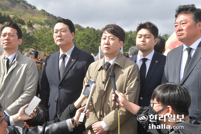 | 이준석 전국민의힘 대표가 3일 열린 제75주년 제주4·3희생자 추념식에서 인터뷰를 진행하고 있다. 제주도사진기자회 |