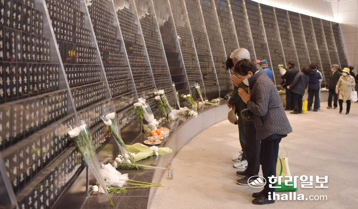 | 3일 제주4·3 평화공원을 찾은 유족들이 위패봉안실에서 희생자들을 추모하고 있다. 제주도사진기자회 |