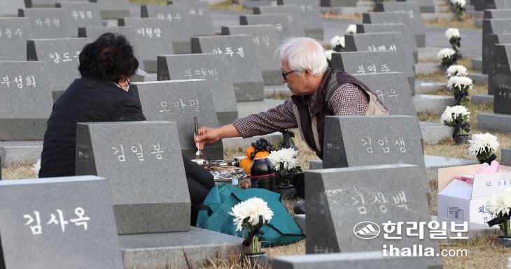 3일 제주4·3 평화공원을 찾은 유족들이 희생자 표지석을 찾아 제를 올리고 있다. 제주도사진기자회