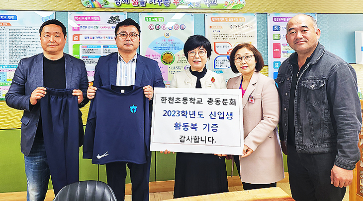 한천초등학교(교장 강혜순) 총동문회(회장 한동철)는 지난달 31일 한천초 교장실에서 올해 입학하는 1학년 신입생들에게 입학 선물로 학교 교표가 새겨진 활동복을 기증했다.