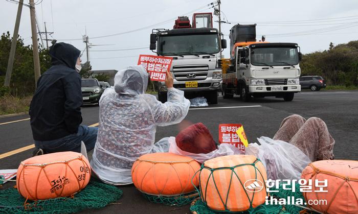 제주시 구좌읍 월정리 해녀회와 동부하수처리장 반대 비상대책위원회 4일 오전 동부하수처리장 정문 앞에서 공사차량을 막아서는 시위를 벌였다. 이로 인해 자재를 반입하려는 공사 차량이 하수처리장으로 진입하지 못했다. 시공사 측은 전날에도 자재 반입을 시도했지만 시위에 막혀 하지 못했다.