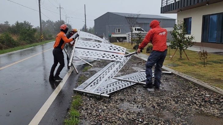 | 소방대원들이 5일 오전 7시43분쯤 제주시 한림읍 금악리에서 강풍의 영향으로 도로에 쓰러진 시설물에 대한 안전조치를 실시하고 있다. 제주서부소방서 제공 |
