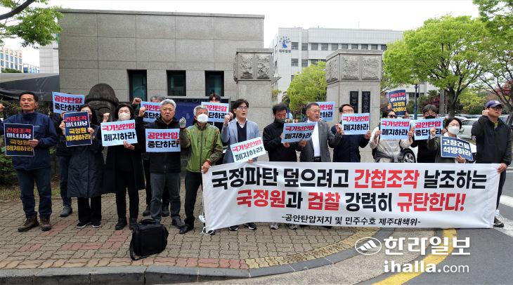 제주대책위는 기자회견문을 통해 "10·29 이태원 참사를 덮으려 시작된 공안 탄압의 목표가 이제는 국정원의 대공수사권 존치로 옮겨가고 있다"며 "금리는 치솟고 인상된 물가에 국민들은 민생 문제를 해결해 달라고 아우성인데 윤석열이 내놓은 것은 공안 탄압"이라고 비판했다.