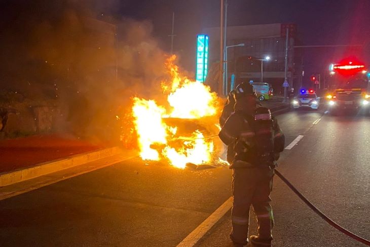 9일 제주서부소방서 등에 따르면 지난 8일 오전 5시31분쯤 제주시 애월읍의 한 도로에서 교통사고 이후 견인 중이던 그랜저HG 차량에서 불이 났다는 신고가 접수됐다.