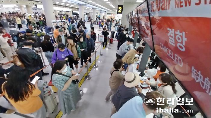 이로인해 제주공항 출발대합실은 대체 항공편을 구하려는 여행객들로 크게 붐비면서 큰 혼잡을 빚고 있다.