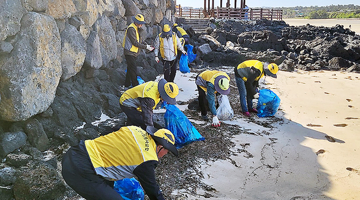 서귀포시 성산읍(읍장 현동식)은 지난 18일 바다환경지킴이 18명이 참여한 가운데 신산리와 온평리 해안가 일대에서 해양폐기물을 수거하는 등 해안가 환경정비를 전개했다.