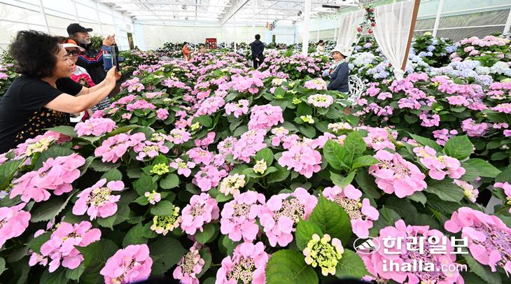 19일 수국 축제가 열리고 있는 서귀포시 남원읍 휴애리자연생활공원을 찾은 관광객들이 탐스럽게 피어난 수국을 배경으로 기념사진을 찍으며 즐거운 시간을 보내고있다. 이상국기자