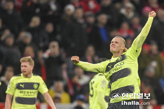 20일(한국시간) 독일 뮌헨의 알리안츠 아레나에서 열린 2022-2023 UCL 8강 2차전에서 골을 넣은 후 환호하는 맨시티 홀란. 연합뉴스