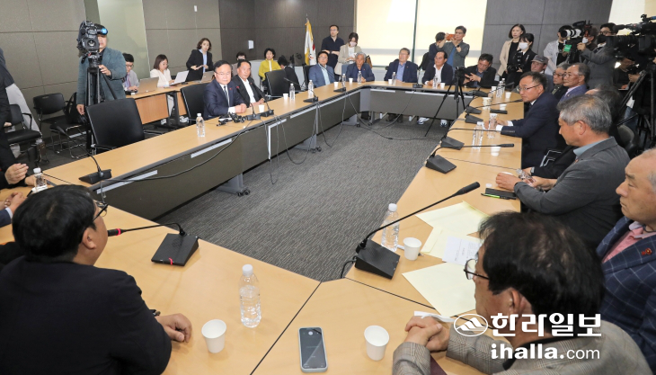 국민의힘 김재원 최고위원이 20일 오후 제주시 봉개동 제주4·3평화기념관을 찾아 4·3 유족들에게 사과하고 있다. 연합뉴스