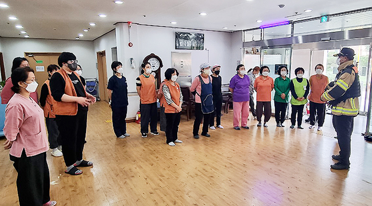 이날 훈련은 많은 피난약자가 입소해 있는 요양원에서 화재 발생시 인명피해 최소화를 위해 대피 피난을 중심으로 진행됐다. 주요 훈련내용은 ▷자위소방대 각 임무별 초기 소화·통보·피난 훈련 등으로 이뤄졌다.