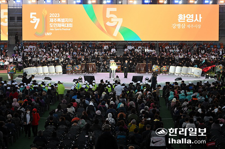 [한라일보] 코로나19로 개최되지 못하거나 축소 또는 가을에 열렸던 제주특별자치도민체육대회가 4년 만에 제자리를 찾았다. 제57회 도민체육대회 개회식이 21일 한림종합운동장에서 화려하게 펼쳐졌다.