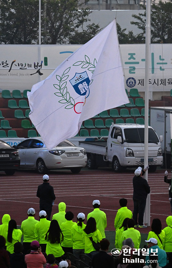 | 21일 한림종합운동장에서 열린 제57회 도민체육대회 개회식에서 대회기가 게양되고 있다. 강희만 기자 |