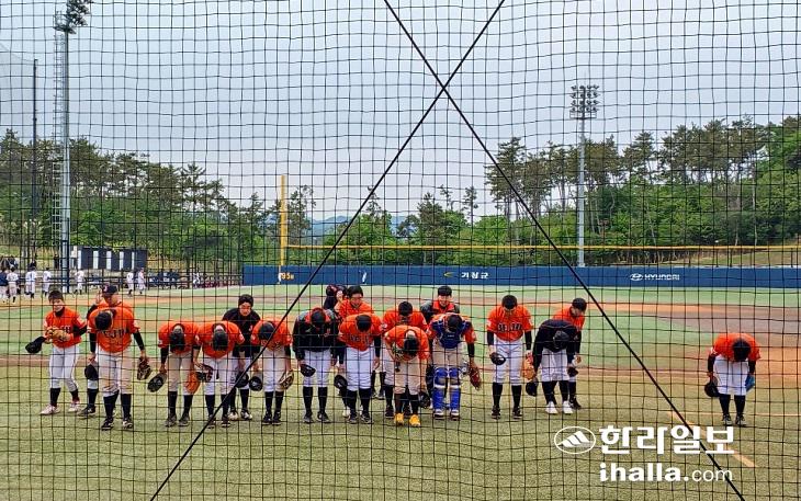 23일 부산시 기장 현대차 드림 볼파크에서 열린 고교야구 주말리그 부산 제주권역 3차전 제주고와 부경고의 경기에서 4-1로 승리한 제주고의 선수들이 인사하고 있다.