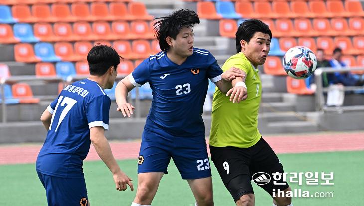 23일 제주시 한림종합운동장에서 열린 제57회 제주특별자치도민체육대회 일반부 축구 남원읍과 대륜동의 결승전에서 양 팀 선수들이 볼 다툼을 벌이고 있다. 강희만 기자