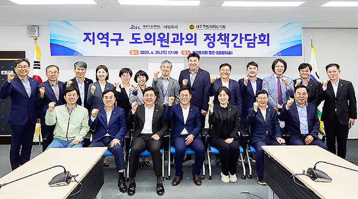 서귀포시는 지난 20일 시청 별관 셋마당에서 민선 8기 주요업무 추진계획 공유 및 서귀포시민의 행복과 지역 발전을 위한 시책 발굴 등 공동 협력 방안을 논의하기 위해 지역구 도의원과의 정책간담회를 개최했다.
