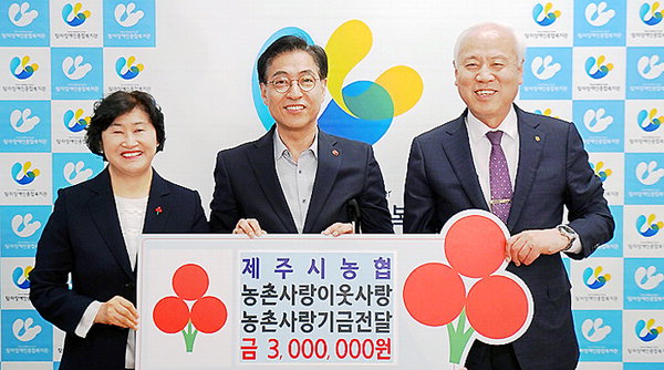 제주시농협(조합장 고봉주)은 지난 20일 탐라장애인종합복지관(관장 고현수)을 방문해 농촌사랑기금 300만원을 제주사회복지공동모금회(회장 강지언)에 기탁했다.