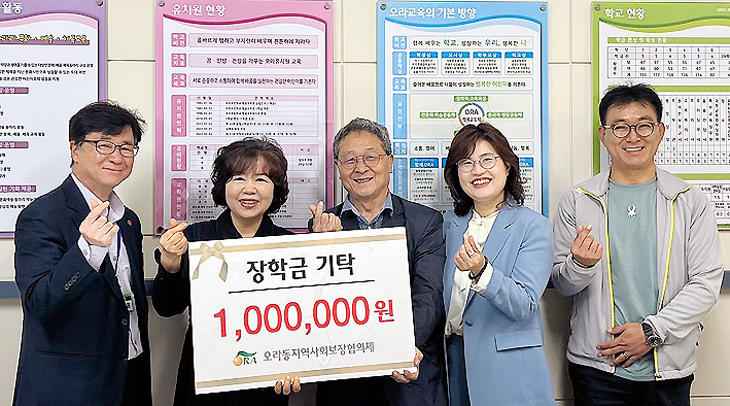 제주시 오라동지역사회보장협의체(공동위원장 진영진·장옥영)는 지난 20일 오라초등학교에 방문해 어려운 아동 가정을 위한 장학금 100만원을 기탁했다.