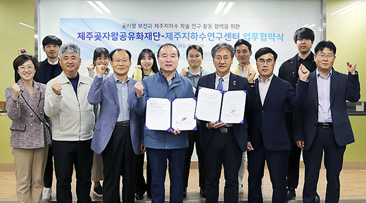제주연구원 제주지하수연구센터(센터장 박원배)와 제주곶자왈공유화재단(이사장 김범훈)은 지난 25일 곶자왈 생태체험관 생태교육센터에서 곶자왈 보전과 제주지하수 학술연구를 위한 협력을 다짐했다.