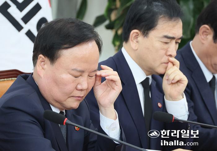 국민의힘 최고위원회의 참석한 김재원·태영호 의원. 연합뉴스