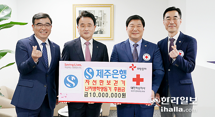 제주은행(은행장 박우혁)은 3일 본점에서 대한적십자사 제주특별자치도지사(회장 정태근)에 난치병 학생 지원과 청소년 공부방 만들기 사업에 사용할 기부금 1000만원을 기탁했다. 이번 기부금 전달은 제주적십자사가 이달 13일 제주시 시민복지타운 광장에서 개최하는 '2023 제주사랑 자선걷기 대회'를 후원하기 위한 것이다.