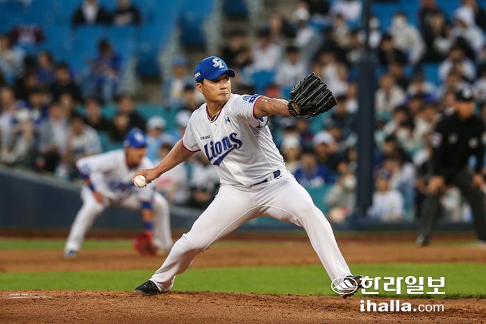 3일 오후 대구 삼성라이온즈 파크에서 열린 신한은행 SOL 2023 KBO리그 키움 히어로즈와 삼성 라이온즈의 경기에서 삼성의 수호신 오승환이 프로 데뷔 19년 만에 선발투수로 나서서 역투하고 있다.