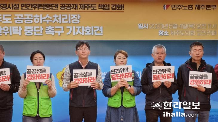 민주노총 제주본부는 이날 제주도의회 도민카페에서 기자회견을 열어 "최근 제주도 상하수도본부가 내년부터 3년 간 서귀포시 공공하수처리장 2곳에 대한 운영과 관리 업무를 민간에 위탁하겠다고 밝혔다"며 "이는 사실상 도내 8개 공공하수처리장에 대한 민간 위탁을 전제로 하는 것"이라고 주장했다.