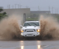 지난 4일 서귀포시 대정읍 무릉리의 한 도로가 침수돼 소방대원들이 고립된 차량 구조를 위해 접근하고 있다. 서부소방서 제공